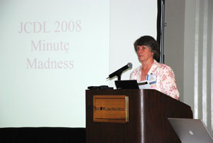 One Minute MadnessIn this ever-popular JCDL tradition, presenters at the Posters/Demos reception lined up for a rapid fire, 60-second opportunity to urge attendees to visit them and learn about their work during the reception. Some gone a thumbnail sketch of their poster or demo; others offered a more provocative approach, more akin to an advertisement than a summary.
